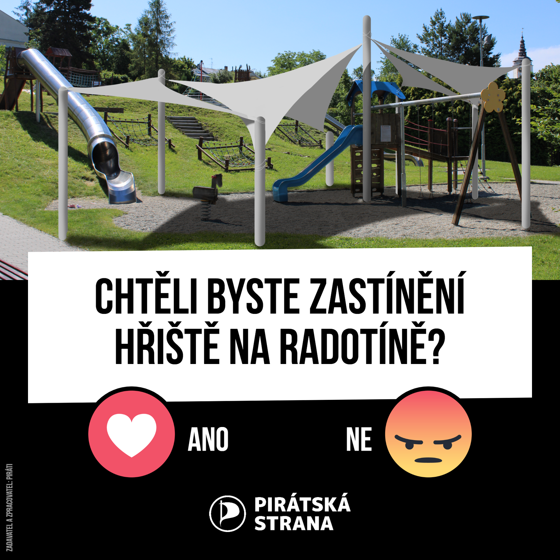 Zeptali jsme se obyvatel Bílovce, jak by se Vám líbilo zastínění hřiště na Radotíně. Již několik rodičů se nám svěřilo s tím, že za horkých letních dní je hřiště na Radotíně nepoužitelné. Není tam totiž žádný stín, není se kam schovat před sluncem. A plechové klouzačky jsou rozpálené tak, že by se na nich dalo usmažit vajíčko.